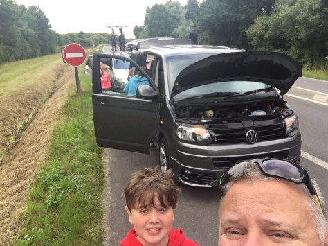About 15 miles into the journey the van started juddering a bit on the motorway. The feeling of dread was unbelievable! The stink of diesel inside the van was really strong, it didn’t feel and smell so good. After many phone calls about recovery and getting it fixed we ended up like this …..  What a great start to our holiday 😡