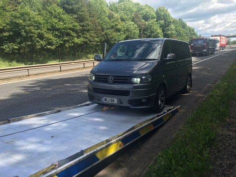 Thankfully we had left  Stoke early in the morning, so at about 1:30 the VW van centre got a call telling them to expect my van back …… On a transporter.
