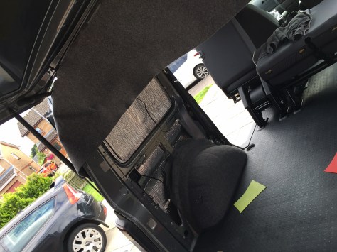 I needn’t have worried. Sunday (virtually all day) was spent cutting/ trimming/ sticking … Rolling! I’m just hoping that they fit when I put them back in the van. Sure as fate just as I was getting the hang of it…. I ran out of Veltrim. There was a great big seam on the last bit that I had left ….. Aargh! All I need is about 1 more metre, longer clips and some carpet to finish the wheel arches. I contacted http://www.harrisonstrimsupplies.co.uk/ to have the extra bits sent up….. Tuesday might see the beginning of re-assembly.